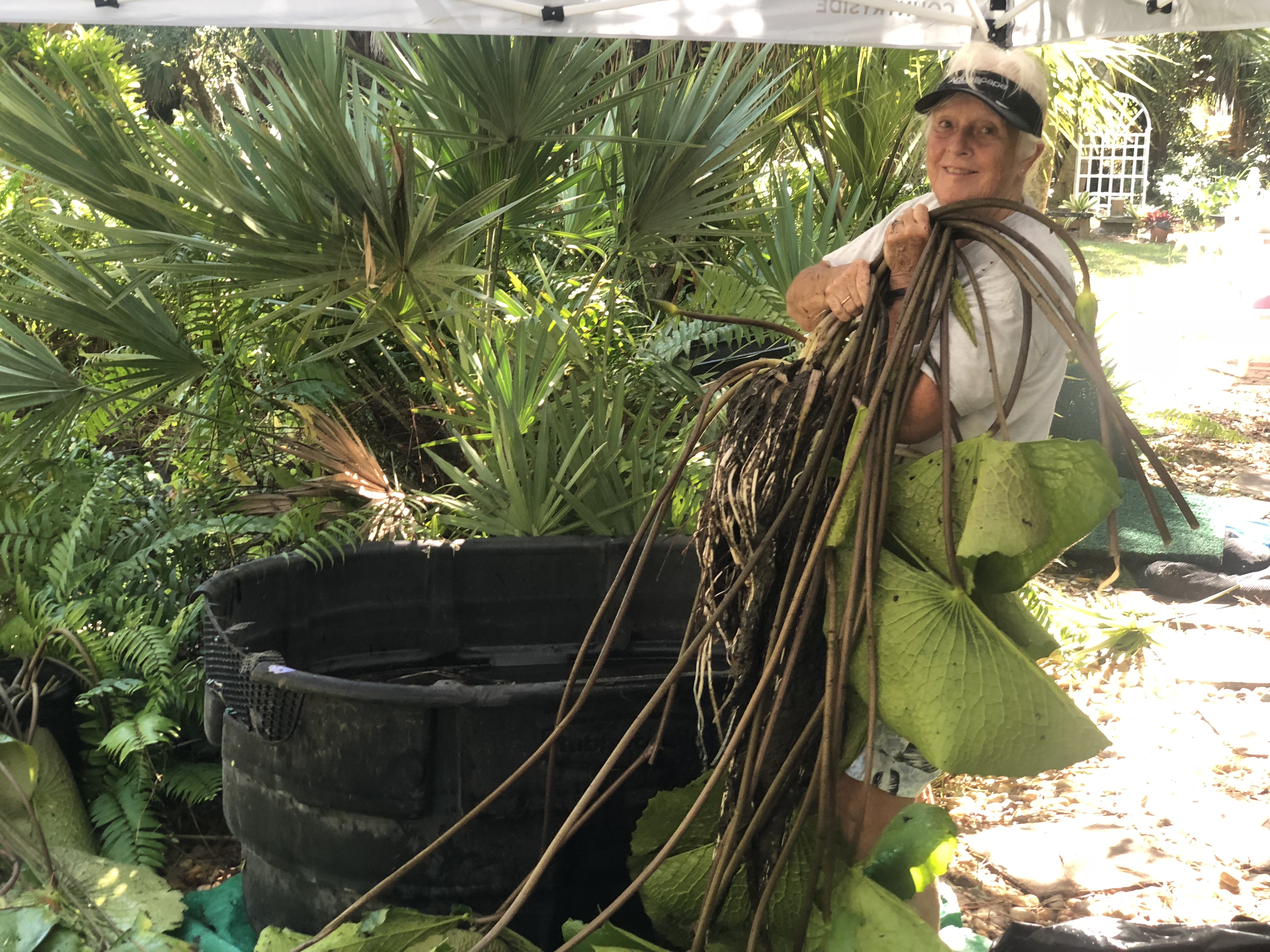 Dennis removing spent blossoms and leaves, and adding fertilizer tabs to the water lilies.
